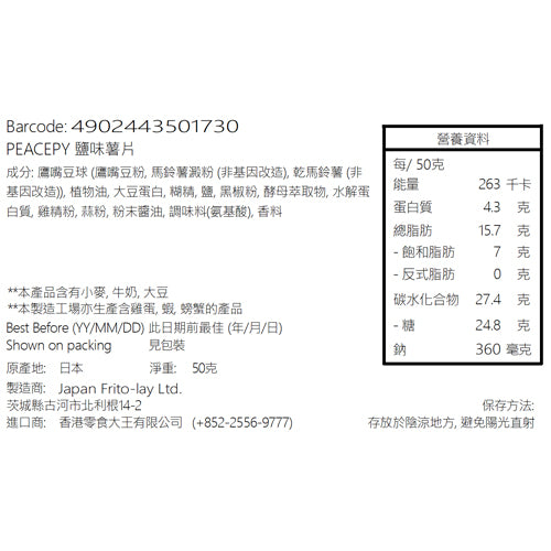 【清貨】[日本直送] Frito-Lay - PEACEPY 鹽味薯片 50g (4902443501730)【賞味期限 : 2022/12/09】儘管它的味道令人上癮,但您可以攝取來自具有身體感覺的豆類的蛋白質和膳食纖維。 它是一種適合新常態時代的零食,我們希望有健康意識的人吃。